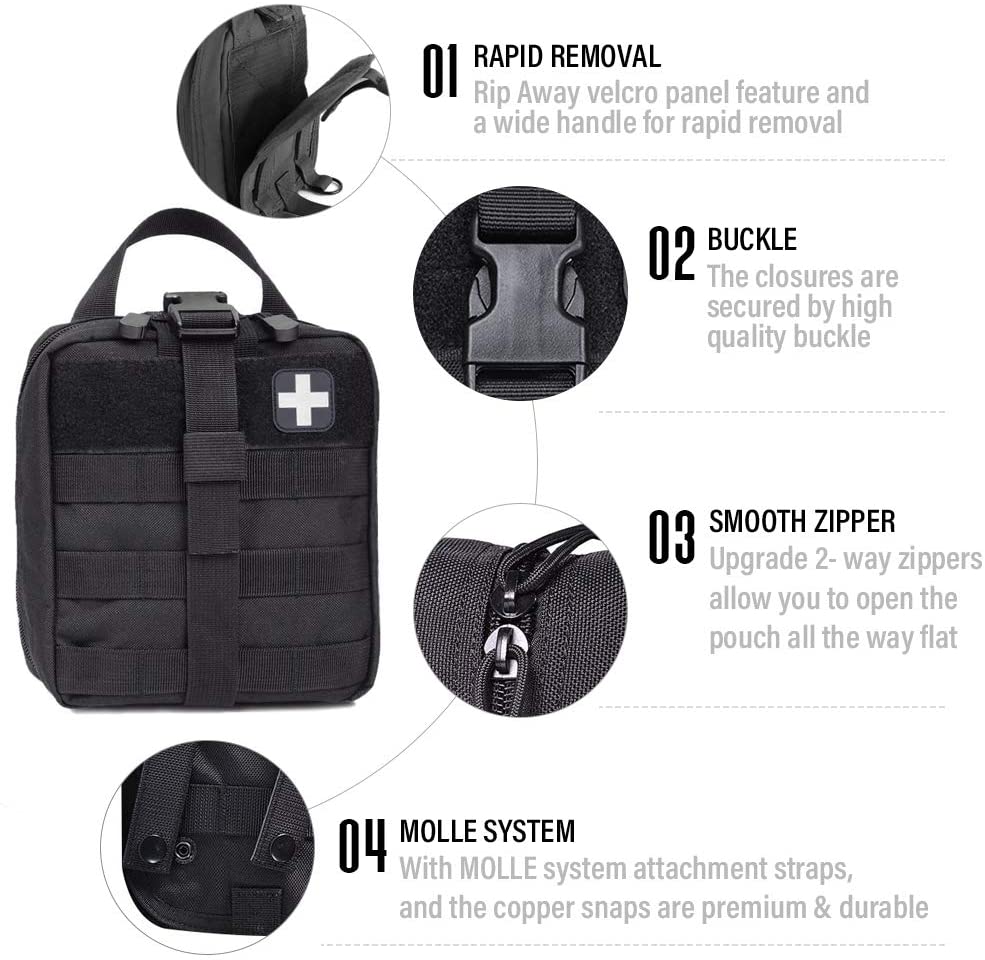 Caracteristica husei medicale militare de prim ajutor tactică neagră include plasture de cruce roșie: DESIGN TRI-FOLD: husă folosește design tri-fold, interior are compartimente spațioase care includ mai multe buzunare, bucle elastice puternice și suporturi pentru instrumente, o curea de siguranță Velcro și compartimente din plasă cu fermoar pentru materiale mici de prim ajutor. DURĂ și DURABILĂ: Husa este fabricat din material nailon 1000D de înaltă calitate, rezistent la zgârieturi și rezistent la uzură. Cusăturile duble robuste conferă acestei pungi medicale tactice durabilitate în orice mediu