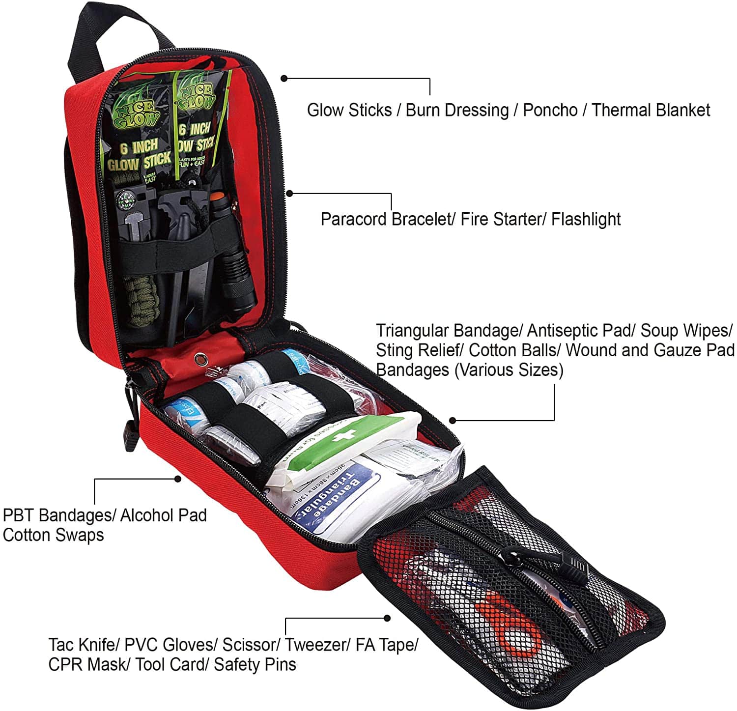 Aplicarea trusei de prim ajutor pentru supraviețuire roșie conține 250 de bucăți zmeu de prim ajutor: trusa conține mai mult decât suficientă cantitate pentru a trata o singură familie sau un grup de prieteni în situații de urgență. Perfect pentru îngrijirea oricăror nevoi medicale sau de urgență în timpul aventurilor în sălbăticie în aer liber, cum ar fi campingul, boy scouts, drumeții, vânătoare și ciclism montan etc.